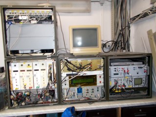 Im Bild links: Empfänger Einheit, mitte: Video-Matrix, rechts: Sender, oben D-ATV, unten analog