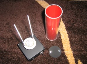 Teileliste: 1 Stück Plexiglasrohr, z.B. 210 mm hoch, 60 mm Außendurchmesser, Innen: 1 Stück quadratischer Kasten etwa 90 x 90 mm, etwa 40-50 mm hoch als Fuß für die Leuchte. Sucht mal in der Elektroabteilung eines Baumarktes nach einem preiswerten Kunststoffgehäuse. 1 Stück Kippschalter z.B. AS500APC von Fa. Reichelt 1 Stück Anzeige LED z.B. LED103A RT Fa. Reichelt 1 Stück Anschlussbuchse für den Hohlstecker des Stecker-Netzteils, je nach Anschluss des Netzteils. 1 Stück DIN-Buchse 5 pol. und Stecker z.B. MAB5 Fa. Reichelt 1 Stück Schnappschalter. Verwendet habe ich einen Schalter mit den Maßen 20x17 mm plus Federblech, s. Foto. Je nach Mischpult ist der Platz dafür nachzumessen. Ein möglicherweise in Frage kommender Typ: MAR1050.5202 Fa. Reichelt 1 Stück LED Strahler z.B. LED Galaxy MR11-Reflektorstrahler G5,3,12V von ELV Elektronik oder analoge Ausführung. Bitte Maße, Betriebsspannung und Strom bei alternativen Strahlern beachten. 2 Stück 1 pol. Stecker oder kleine Klemme zum Anschluss an den LED Strahler 1 Stück M3 Gewindestange 1m vom Baumarkt. Es werden 2 Stück ca. 225 mm zum Aufbau gebraucht. Dazu 10 M3 Muttern und 2 Unterlegscheiben 1 Stück Sperrholz ca. 3mm dick, für die Aufnahmescheibe des LED Strahlers und für den oberen Deckel vom Baumarkt. 1 Stück Anschlusskabel 2 adr. möglichst dünn aber flexibel, auch Audiokabel geht. 1 Stück Stecker-Netzteil z.B. SNT 1000 5V , Fa. Reichelt oder jedes andere 12V DC Stecker-Netzteil. dazu etwas Kleber, Lackspraydose schwarz, Draht zum Verdrahten, und Lötwerkzeug