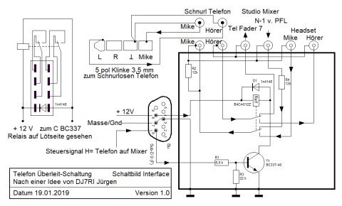 Mein Telefon Interface dient mir zur komfortablen Umschaltung zwischen Telefon-Headset und Studio Anlage ( Mischpult ). Alle meine Fader erhielten einen schon früher, nachträglich außen angebauten Magnetschalter, der das Relais im Telefon-Interface ansprechen läßt.