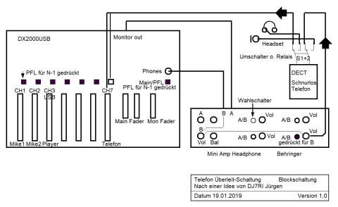 Wer einen Kopfhörer-Verstärker/Verteiler hat mag die komfortable Verteilung nutzen, siehe mein Blockbild. Die Umschaltung zwischen dem Telefon Headset und der Studioanlage kann man manuell über ein Schalter oder halbautomatisch über einen Fader-Schalter am Telefonkanal, bei mir Kanal 7, ausführen lassen.