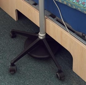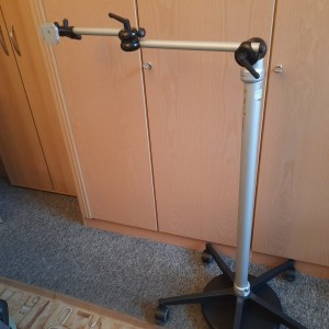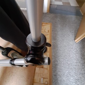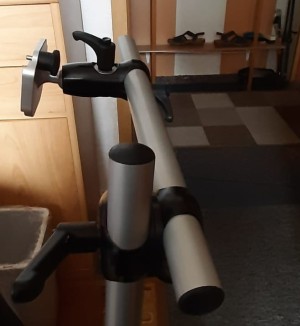 Ein Problem gibt es doch noch. Das Bodenstativ hat 5 Füße mit Rollen ,wie du das von einem Bürostuhl her kennst damit er stabil steht. Das Stativ für die Smartbox hat noch ein Gewicht der die Last der Smartbox aus gleicht. Der relativ kurze Arm des „Galgens“ reicht nicht in die Mitte vom Bett. Da ich ein Bettkasten habe ist guter Rat teuer, wenn nicht die Familie jemanden hat, der sich mit Holzbearbeitung auskennt. Ich habe zudem einen Einlegerahmen (in das alte Bett eingelegte, verstellbare Krankenbett) der aber für die Füße des Stativ ca. 30 cm Platz lässt.
