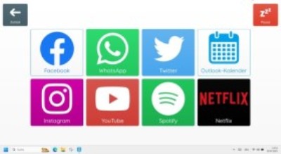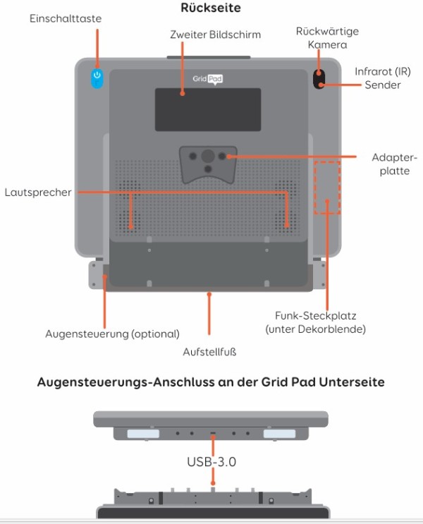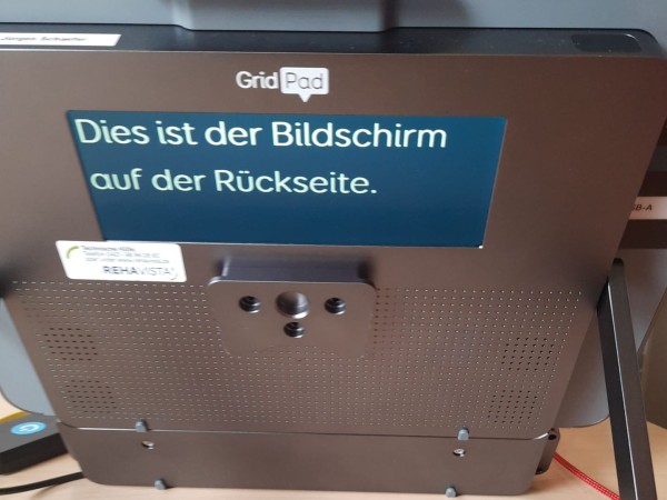 Wenn die Smartbox (oben links, mit Blick auf die Rückseite) mit dem blauen Drucktaster eingeschaltet wurde zeigt das die im Drucktaster befindliche LED an und auf dem Bildschirm rechts oben ein weisser Punkt. Bei mir ist noch kurz der Desktop zu sehen, dann die gewählte Bedienobefläche GRID 3 mit großen Feldern, die mit den Augen sowie Maus angesteuert werden können.
