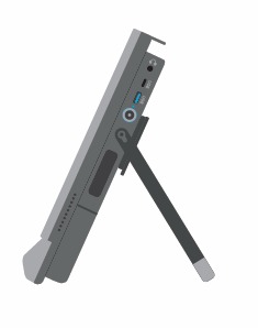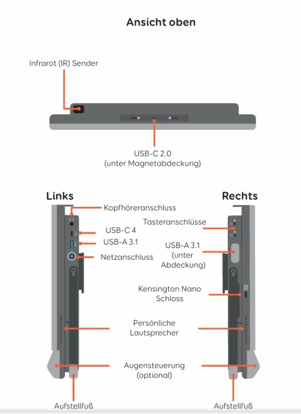 Auf der Rückseite bzw. an den Seiten befinden sich: ein stabiler Aufsteller und die Anschlüsse für: